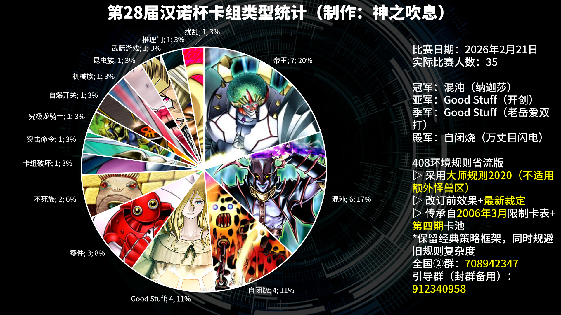 本次比赛共计40人报名,35人实际参赛,这次比赛即使不是历届汉诺杯里人数最多,也是历届汉诺杯里常规赛(408环境标准版)最多的了,而且卡组种类也丰富到令人震惊,甚至还有魂得不行的“武藤游戏”分类!本次比赛既是一个新的规模突破,同时也是本人根据一些办赛经验总结进行实践的脚踏实地尝试,整体而言参赛者们还是挺高兴、挺满意的,本人也后参赛者之乐而乐。仰望星空一下,希望以后有更多的群友可以一起来举办更多408环境赛事,用决斗给大家带来笑容。最后感谢赞助义父们:MCPro决斗暗网、梁山卡牌、虹霓 ,后面几天会整理好奖励逐步发放。下次汉诺杯,期待看见你的参与!